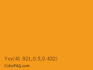 Yxy 41.921,0.5,0.432 Color is a normal orange color and the nearest color is Tree Poppy #fc9c1d. Hex code #f3991b and RGB value is rgb(243,153,27). In RGB color space, this color is composed of 95% red, 60% green, 11% blue, In CMYK color space, this color is composed of 0% cyan, 37% magenta, 89% yellow , 5% black , In HSL color space, this color has a hue angle of 35° , 90% saturation and 53% lightness.