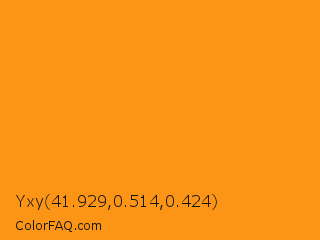 Yxy 41.929,0.514,0.424 Color is a normal orange color and the nearest color is West Side #ff910f. Hex code #fc9415 and RGB value is rgb(252,148,21). In RGB color space, this color is composed of 99% red, 58% green, 8% blue, In CMYK color space, this color is composed of 0% cyan, 41% magenta, 92% yellow , 1% black , In HSL color space, this color has a hue angle of 33° , 97% saturation and 54% lightness.