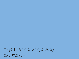 Yxy 41.944,0.244,0.266 Color is a light blue color and the nearest color is Light Cobalt Blue #88ace0. Hex code #80b2e1 and RGB value is rgb(128,178,225). In RGB color space, this color is composed of 50% red, 70% green, 88% blue, In CMYK color space, this color is composed of 43% cyan, 21% magenta, 0% yellow , 12% black , In HSL color space, this color has a hue angle of 209° , 62% saturation and 69% lightness.