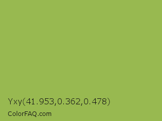 Yxy 41.953,0.362,0.478 Color is a normal lime color and the nearest color is Middle Green Yellow #acbf60. Hex code #98b950 and RGB value is rgb(152,185,80). In RGB color space, this color is composed of 60% red, 73% green, 31% blue, In CMYK color space, this color is composed of 18% cyan, 0% magenta, 57% yellow , 27% black , In HSL color space, this color has a hue angle of 79° , 43% saturation and 52% lightness.