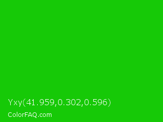 Yxy 41.959,0.302,0.596 Color is a normal green color and the nearest color is Vivid Malachite #00cc33. Hex code #16c907 and RGB value is rgb(22,201,7). In RGB color space, this color is composed of 9% red, 79% green, 3% blue, In CMYK color space, this color is composed of 89% cyan, 0% magenta, 97% yellow , 21% black , In HSL color space, this color has a hue angle of 115° , 93% saturation and 41% lightness.
