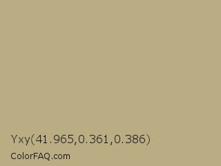 Yxy 41.965,0.361,0.386 Color is a light yellow color and the nearest color is Sand Ecru #c2b280. Hex code #baad83 and RGB value is rgb(186,173,131). In RGB color space, this color is composed of 73% red, 68% green, 51% blue, In CMYK color space, this color is composed of 0% cyan, 7% magenta, 30% yellow , 27% black , In HSL color space, this color has a hue angle of 46° , 28% saturation and 62% lightness.