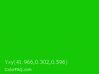 Yxy 41.966,0.302,0.596 Color is a normal green color and the nearest color is Vivid Malachite #00cc33. Hex code #16c907 and RGB value is rgb(22,201,7). In RGB color space, this color is composed of 9% red, 79% green, 3% blue, In CMYK color space, this color is composed of 89% cyan, 0% magenta, 97% yellow , 21% black , In HSL color space, this color has a hue angle of 115° , 93% saturation and 41% lightness.