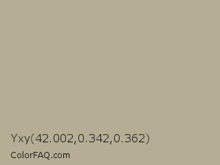Yxy 42.002,0.342,0.362 Color is a light orange color and the nearest color is Heathered Gray #b6b095. Hex code #b6ad95 and RGB value is rgb(182,173,149). In RGB color space, this color is composed of 71% red, 68% green, 58% blue, In CMYK color space, this color is composed of 0% cyan, 5% magenta, 18% yellow , 29% black , In HSL color space, this color has a hue angle of 44° , 18% saturation and 65% lightness.