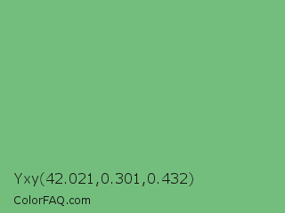 Yxy 42.021,0.301,0.432 Color is a normal green color and the nearest color is Iguana Green #71bc78. Hex code #74be7d and RGB value is rgb(116,190,125). In RGB color space, this color is composed of 45% red, 75% green, 49% blue, In CMYK color space, this color is composed of 39% cyan, 0% magenta, 34% yellow , 25% black , In HSL color space, this color has a hue angle of 127° , 36% saturation and 60% lightness.