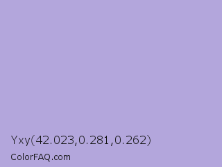 Yxy 42.023,0.281,0.262 Color is a light indigo color and the nearest color is Cold Purple #aba0d9. Hex code #b3a6dc and RGB value is rgb(179,166,220). In RGB color space, this color is composed of 70% red, 65% green, 86% blue, In CMYK color space, this color is composed of 19% cyan, 25% magenta, 0% yellow , 14% black , In HSL color space, this color has a hue angle of 254° , 44% saturation and 76% lightness.