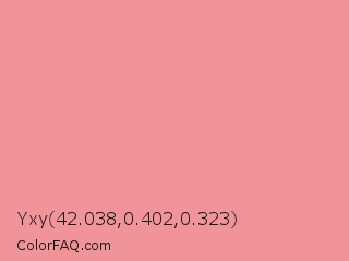Yxy 42.038,0.402,0.323 Color is a light red color and the nearest color is Sea Pink #ed989e. Hex code #f0949a and RGB value is rgb(240,148,154). In RGB color space, this color is composed of 94% red, 58% green, 60% blue, In CMYK color space, this color is composed of 0% cyan, 38% magenta, 36% yellow , 6% black , In HSL color space, this color has a hue angle of 356° , 75% saturation and 76% lightness.