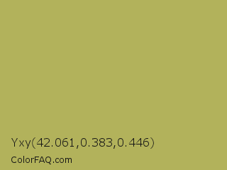 Yxy 42.061,0.383,0.446 Color is a normal yellow color and the nearest color is Olive Green #b5b35c. Hex code #b2b25b and RGB value is rgb(178,178,91). In RGB color space, this color is composed of 70% red, 70% green, 36% blue, In CMYK color space, this color is composed of 0% cyan, 0% magenta, 49% yellow , 30% black , In HSL color space, this color has a hue angle of 60° , 36% saturation and 53% lightness.