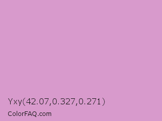 Yxy 42.07,0.327,0.271 Color is a light magenta color and the nearest color is Light Medium Orchid #d39bcb. Hex code #d89acc and RGB value is rgb(216,154,204). In RGB color space, this color is composed of 85% red, 60% green, 80% blue, In CMYK color space, this color is composed of 0% cyan, 29% magenta, 6% yellow , 15% black , In HSL color space, this color has a hue angle of 312° , 44% saturation and 73% lightness.