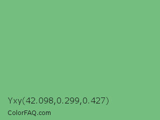 Yxy 42.098,0.299,0.427 Color is a normal green color and the nearest color is Iguana Green #71bc78. Hex code #74be80 and RGB value is rgb(116,190,128). In RGB color space, this color is composed of 45% red, 75% green, 50% blue, In CMYK color space, this color is composed of 39% cyan, 0% magenta, 33% yellow , 25% black , In HSL color space, this color has a hue angle of 130° , 36% saturation and 60% lightness.