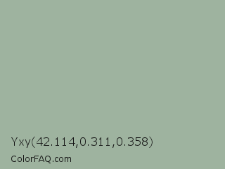 Yxy 42.114,0.311,0.358 Color is a light green color and the nearest color is Bud #a8ae9c. Hex code #9eb39f and RGB value is rgb(158,179,159). In RGB color space, this color is composed of 62% red, 70% green, 62% blue, In CMYK color space, this color is composed of 12% cyan, 0% magenta, 11% yellow , 30% black , In HSL color space, this color has a hue angle of 123° , 12% saturation and 66% lightness.
