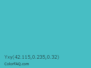 Yxy 42.115,0.235,0.32 Color is a normal cyan color and the nearest color is Sea Serpent #4bc7cf. Hex code #47bec4 and RGB value is rgb(71,190,196). In RGB color space, this color is composed of 28% red, 75% green, 77% blue, In CMYK color space, this color is composed of 64% cyan, 3% magenta, 0% yellow , 23% black , In HSL color space, this color has a hue angle of 183° , 51% saturation and 52% lightness.