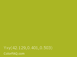 Yxy 42.129,0.401,0.503 Color is a normal yellow color and the nearest color is Acid Green #b0bf1a. Hex code #aab624 and RGB value is rgb(170,182,36). In RGB color space, this color is composed of 67% red, 71% green, 14% blue, In CMYK color space, this color is composed of 7% cyan, 0% magenta, 80% yellow , 29% black , In HSL color space, this color has a hue angle of 65° , 67% saturation and 43% lightness.