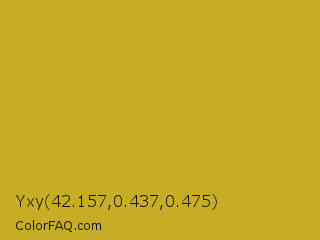 Yxy 42.157,0.437,0.475 Color is a normal yellow color and the nearest color is Hokey Pokey #c8a528. Hex code #c7ad25 and RGB value is rgb(199,173,37). In RGB color space, this color is composed of 78% red, 68% green, 15% blue, In CMYK color space, this color is composed of 0% cyan, 13% magenta, 81% yellow , 22% black , In HSL color space, this color has a hue angle of 50° , 69% saturation and 46% lightness.