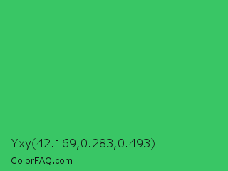 Yxy 42.169,0.283,0.493 Color is a normal green color and the nearest color is UFO Green #3cd070. Hex code #39c665 and RGB value is rgb(57,198,101). In RGB color space, this color is composed of 22% red, 78% green, 40% blue, In CMYK color space, this color is composed of 71% cyan, 0% magenta, 49% yellow , 22% black , In HSL color space, this color has a hue angle of 139° , 55% saturation and 50% lightness.