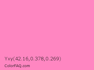 Yxy 42.16,0.378,0.269 Color is a light rose color and the nearest color is Persian Pink #f77fbe. Hex code #ff86c1 and RGB value is rgb(255,134,193). In RGB color space, this color is composed of 100% red, 53% green, 76% blue, In CMYK color space, this color is composed of 0% cyan, 47% magenta, 24% yellow , 0% black , In HSL color space, this color has a hue angle of 331° , 100% saturation and 76% lightness.