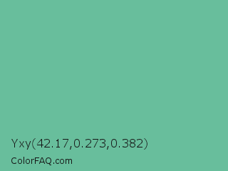 Yxy 42.17,0.273,0.382 Color is a normal green color and the nearest color is Silver Tree #66b58f. Hex code #68be9c and RGB value is rgb(104,190,156). In RGB color space, this color is composed of 41% red, 75% green, 61% blue, In CMYK color space, this color is composed of 45% cyan, 0% magenta, 18% yellow , 25% black , In HSL color space, this color has a hue angle of 156° , 40% saturation and 58% lightness.