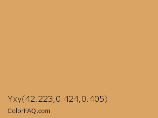 Yxy 42.223,0.424,0.405 Color is a light orange color and the nearest color is Earth Yellow #e1a95f. Hex code #d9a464 and RGB value is rgb(217,164,100). In RGB color space, this color is composed of 85% red, 64% green, 39% blue, In CMYK color space, this color is composed of 0% cyan, 24% magenta, 54% yellow , 15% black , In HSL color space, this color has a hue angle of 33° , 61% saturation and 62% lightness.