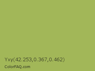 Yxy 42.253,0.367,0.462 Color is a normal lime color and the nearest color is Middle Green Yellow #acbf60. Hex code #a2b758 and RGB value is rgb(162,183,88). In RGB color space, this color is composed of 64% red, 72% green, 35% blue, In CMYK color space, this color is composed of 11% cyan, 0% magenta, 52% yellow , 28% black , In HSL color space, this color has a hue angle of 73° , 40% saturation and 53% lightness.