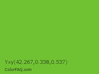 Yxy 42.267,0.338,0.537 Color is a normal green color and the nearest color is Green RYB #66b032. Hex code #70c233 and RGB value is rgb(112,194,51). In RGB color space, this color is composed of 44% red, 76% green, 20% blue, In CMYK color space, this color is composed of 42% cyan, 0% magenta, 74% yellow , 24% black , In HSL color space, this color has a hue angle of 94° , 58% saturation and 48% lightness.