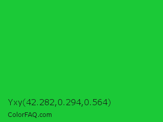 Yxy 42.282,0.294,0.564 Color is a normal green color and the nearest color is Lime Green #32cd32. Hex code #1bc937 and RGB value is rgb(27,201,55). In RGB color space, this color is composed of 11% red, 79% green, 22% blue, In CMYK color space, this color is composed of 87% cyan, 0% magenta, 73% yellow , 21% black , In HSL color space, this color has a hue angle of 130° , 76% saturation and 45% lightness.