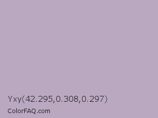 Yxy 42.295,0.308,0.297 Color is a light purple color and the nearest color is London Hue #bea6c3. Hex code #baa8c1 and RGB value is rgb(186,168,193). In RGB color space, this color is composed of 73% red, 66% green, 76% blue, In CMYK color space, this color is composed of 4% cyan, 13% magenta, 0% yellow , 24% black , In HSL color space, this color has a hue angle of 283° , 17% saturation and 71% lightness.