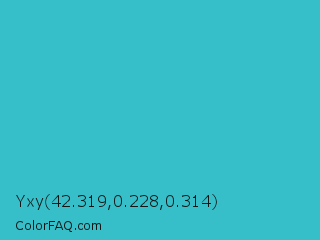 Yxy 42.319,0.228,0.314 Color is a normal cyan color and the nearest color is Maximum Blue Green #30bfbf. Hex code #36bfc9 and RGB value is rgb(54,191,201). In RGB color space, this color is composed of 21% red, 75% green, 79% blue, In CMYK color space, this color is composed of 73% cyan, 5% magenta, 0% yellow , 21% black , In HSL color space, this color has a hue angle of 184° , 58% saturation and 50% lightness.