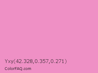 Yxy 42.328,0.357,0.271 Color is a light magenta color and the nearest color is Pastel Magenta #f49ac2. Hex code #ef90c5 and RGB value is rgb(239,144,197). In RGB color space, this color is composed of 94% red, 56% green, 77% blue, In CMYK color space, this color is composed of 0% cyan, 40% magenta, 18% yellow , 6% black , In HSL color space, this color has a hue angle of 327° , 75% saturation and 75% lightness.