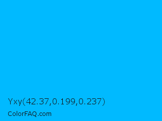 Yxy 42.37,0.199,0.237 Color is a normal blue color and the nearest color is Blue Bolt #00b9fb. Hex code #00baff and RGB value is rgb(0,186,255). In RGB color space, this color is composed of 0% red, 73% green, 100% blue, In CMYK color space, this color is composed of 100% cyan, 27% magenta, 0% yellow , 0% black , In HSL color space, this color has a hue angle of 196° , 100% saturation and 50% lightness.