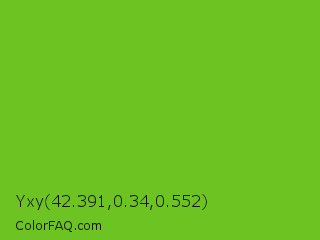 Yxy 42.391,0.34,0.552 Color is a normal green color and the nearest color is Lima #76bd17. Hex code #6dc322 and RGB value is rgb(109,195,34). In RGB color space, this color is composed of 43% red, 76% green, 13% blue, In CMYK color space, this color is composed of 44% cyan, 0% magenta, 83% yellow , 24% black , In HSL color space, this color has a hue angle of 92° , 70% saturation and 45% lightness.