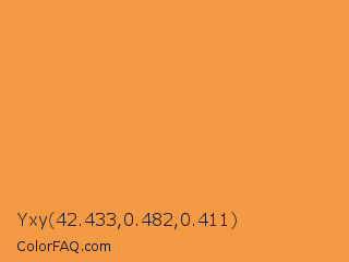 Yxy 42.433,0.482,0.411 Color is a light orange color and the nearest color is Neon Carrot #ffa343. Hex code #f49944 and RGB value is rgb(244,153,68). In RGB color space, this color is composed of 96% red, 60% green, 27% blue, In CMYK color space, this color is composed of 0% cyan, 37% magenta, 72% yellow , 4% black , In HSL color space, this color has a hue angle of 29° , 89% saturation and 61% lightness.