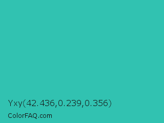 Yxy 42.436,0.239,0.356 Color is a normal cyan color and the nearest color is Maximum Blue Green #30bfbf. Hex code #31c2b1 and RGB value is rgb(49,194,177). In RGB color space, this color is composed of 19% red, 76% green, 69% blue, In CMYK color space, this color is composed of 75% cyan, 0% magenta, 9% yellow , 24% black , In HSL color space, this color has a hue angle of 173° , 60% saturation and 48% lightness.