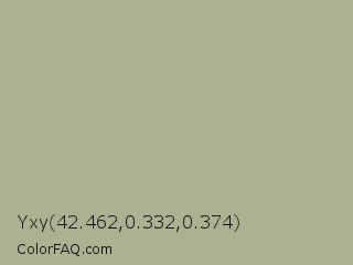 Yxy 42.462,0.332,0.374 Color is a light lime color and the nearest color is Locust #a8af8e. Hex code #aab292 and RGB value is rgb(170,178,146). In RGB color space, this color is composed of 67% red, 70% green, 57% blue, In CMYK color space, this color is composed of 4% cyan, 0% magenta, 18% yellow , 30% black , In HSL color space, this color has a hue angle of 75° , 17% saturation and 64% lightness.