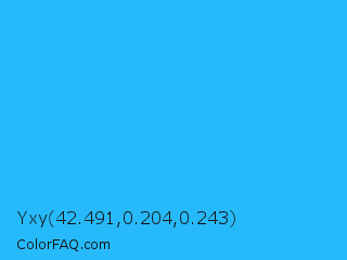 Yxy 42.491,0.204,0.243 Color is a normal blue color and the nearest color is Spiro Disco Ball #0fc0fc. Hex code #27bafa and RGB value is rgb(39,186,250). In RGB color space, this color is composed of 15% red, 73% green, 98% blue, In CMYK color space, this color is composed of 84% cyan, 26% magenta, 0% yellow , 2% black , In HSL color space, this color has a hue angle of 198° , 95% saturation and 57% lightness.
