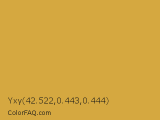 Yxy 42.522,0.443,0.444 Color is a normal orange color and the nearest color is Gold Metallic #d4af37. Hex code #d5a840 and RGB value is rgb(213,168,64). In RGB color space, this color is composed of 84% red, 66% green, 25% blue, In CMYK color space, this color is composed of 0% cyan, 21% magenta, 70% yellow , 16% black , In HSL color space, this color has a hue angle of 42° , 64% saturation and 54% lightness.