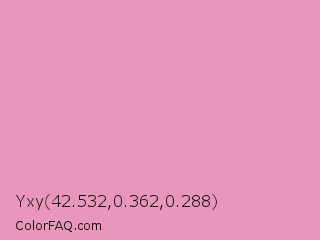 Yxy 42.532,0.362,0.288 Color is a light rose color and the nearest color is Amaranth Pink #f19cbb. Hex code #ea95ba and RGB value is rgb(234,149,186). In RGB color space, this color is composed of 92% red, 58% green, 73% blue, In CMYK color space, this color is composed of 0% cyan, 36% magenta, 21% yellow , 8% black , In HSL color space, this color has a hue angle of 334° , 67% saturation and 75% lightness.