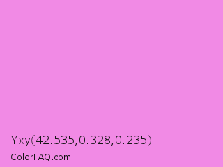 Yxy 42.535,0.328,0.235 Color is a light magenta color and the nearest color is Pale Magenta #f984e5. Hex code #f18ae5 and RGB value is rgb(241,138,229). In RGB color space, this color is composed of 95% red, 54% green, 90% blue, In CMYK color space, this color is composed of 0% cyan, 43% magenta, 5% yellow , 5% black , In HSL color space, this color has a hue angle of 307° , 79% saturation and 74% lightness.