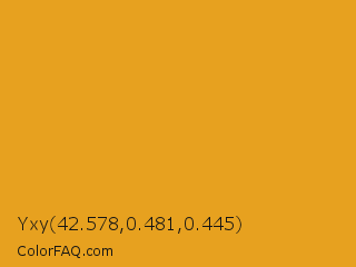 Yxy 42.578,0.481,0.445 Color is a normal orange color and the nearest color is Marigold #eaa221. Hex code #e7a11f and RGB value is rgb(231,161,31). In RGB color space, this color is composed of 91% red, 63% green, 12% blue, In CMYK color space, this color is composed of 0% cyan, 30% magenta, 87% yellow , 9% black , In HSL color space, this color has a hue angle of 39° , 81% saturation and 51% lightness.