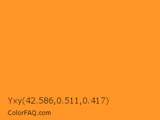 Yxy 42.586,0.511,0.417 Color is a normal orange color and the nearest color is Sunshade #ff9e2c. Hex code #ff9427 and RGB value is rgb(255,148,39). In RGB color space, this color is composed of 100% red, 58% green, 15% blue, In CMYK color space, this color is composed of 0% cyan, 42% magenta, 85% yellow , 0% black , In HSL color space, this color has a hue angle of 30° , 100% saturation and 58% lightness.