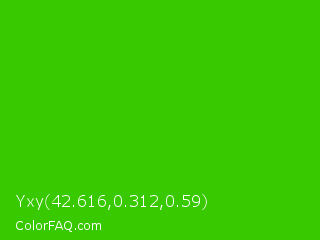 Yxy 42.616,0.312,0.59 Color is a normal green color and the nearest color is Harlequin Green #46cb18. Hex code #38c901 and RGB value is rgb(56,201,1). In RGB color space, this color is composed of 22% red, 79% green, 0% blue, In CMYK color space, this color is composed of 72% cyan, 0% magenta, 100% yellow , 21% black , In HSL color space, this color has a hue angle of 104° , 99% saturation and 40% lightness.