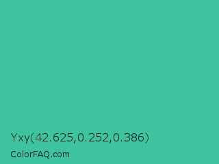 Yxy 42.625,0.252,0.386 Color is a normal cyan color and the nearest color is Puerto Rico #3fc1aa. Hex code #3dc3a0 and RGB value is rgb(61,195,160). In RGB color space, this color is composed of 24% red, 76% green, 63% blue, In CMYK color space, this color is composed of 69% cyan, 0% magenta, 18% yellow , 24% black , In HSL color space, this color has a hue angle of 164° , 53% saturation and 50% lightness.