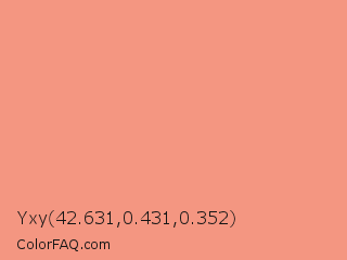 Yxy 42.631,0.431,0.352 Color is a light red color and the nearest color is Vivid Tangerine #ff9980. Hex code #f49681 and RGB value is rgb(244,150,129). In RGB color space, this color is composed of 96% red, 59% green, 51% blue, In CMYK color space, this color is composed of 0% cyan, 39% magenta, 47% yellow , 4% black , In HSL color space, this color has a hue angle of 11° , 84% saturation and 73% lightness.