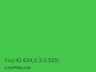 Yxy 42.634,0.3,0.529 Color is a normal green color and the nearest color is Lime Green #32cd32. Hex code #45c74c and RGB value is rgb(69,199,76). In RGB color space, this color is composed of 27% red, 78% green, 30% blue, In CMYK color space, this color is composed of 65% cyan, 0% magenta, 62% yellow , 22% black , In HSL color space, this color has a hue angle of 123° , 54% saturation and 53% lightness.