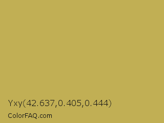 Yxy 42.637,0.405,0.444 Color is a normal yellow color and the nearest color is Vegas Gold #c5b358. Hex code #c1af54 and RGB value is rgb(193,175,84). In RGB color space, this color is composed of 76% red, 69% green, 33% blue, In CMYK color space, this color is composed of 0% cyan, 9% magenta, 56% yellow , 24% black , In HSL color space, this color has a hue angle of 50° , 47% saturation and 54% lightness.