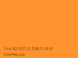 Yxy 42.637,0.508,0.414 Color is a normal orange color and the nearest color is Neon Carrot Crayola #ff9933. Hex code #ff942e and RGB value is rgb(255,148,46). In RGB color space, this color is composed of 100% red, 58% green, 18% blue, In CMYK color space, this color is composed of 0% cyan, 42% magenta, 82% yellow , 0% black , In HSL color space, this color has a hue angle of 29° , 100% saturation and 59% lightness.