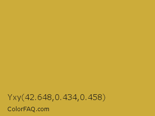 Yxy 42.648,0.434,0.458 Color is a normal yellow color and the nearest color is Gold Metallic #d4af37. Hex code #ccac3a and RGB value is rgb(204,172,58). In RGB color space, this color is composed of 80% red, 67% green, 23% blue, In CMYK color space, this color is composed of 0% cyan, 16% magenta, 72% yellow , 20% black , In HSL color space, this color has a hue angle of 47° , 59% saturation and 51% lightness.