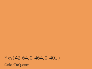 Yxy 42.64,0.464,0.401 Color is a light orange color and the nearest color is Tan Hide #fa9d5a. Hex code #f09b56 and RGB value is rgb(240,155,86). In RGB color space, this color is composed of 94% red, 61% green, 34% blue, In CMYK color space, this color is composed of 0% cyan, 35% magenta, 64% yellow , 6% black , In HSL color space, this color has a hue angle of 27° , 84% saturation and 64% lightness.