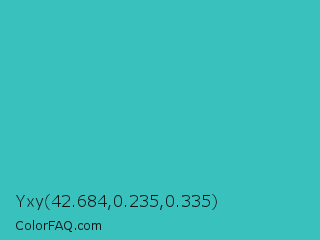 Yxy 42.684,0.235,0.335 Color is a normal cyan color and the nearest color is Maximum Blue Green #30bfbf. Hex code #39c1bd and RGB value is rgb(57,193,189). In RGB color space, this color is composed of 22% red, 76% green, 74% blue, In CMYK color space, this color is composed of 70% cyan, 0% magenta, 2% yellow , 24% black , In HSL color space, this color has a hue angle of 178° , 54% saturation and 49% lightness.