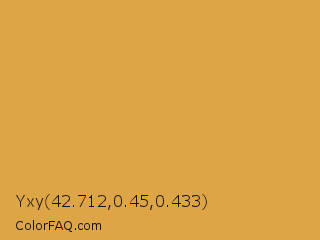 Yxy 42.712,0.45,0.433 Color is a normal orange color and the nearest color is Anzac #e0b646. Hex code #dda545 and RGB value is rgb(221,165,69). In RGB color space, this color is composed of 87% red, 65% green, 27% blue, In CMYK color space, this color is composed of 0% cyan, 25% magenta, 69% yellow , 13% black , In HSL color space, this color has a hue angle of 38° , 69% saturation and 57% lightness.