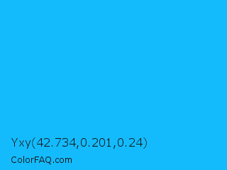 Yxy 42.734,0.201,0.24 Color is a normal blue color and the nearest color is Spiro Disco Ball #0fc0fc. Hex code #13bbfd and RGB value is rgb(19,187,253). In RGB color space, this color is composed of 7% red, 73% green, 99% blue, In CMYK color space, this color is composed of 92% cyan, 26% magenta, 0% yellow , 1% black , In HSL color space, this color has a hue angle of 197° , 98% saturation and 53% lightness.